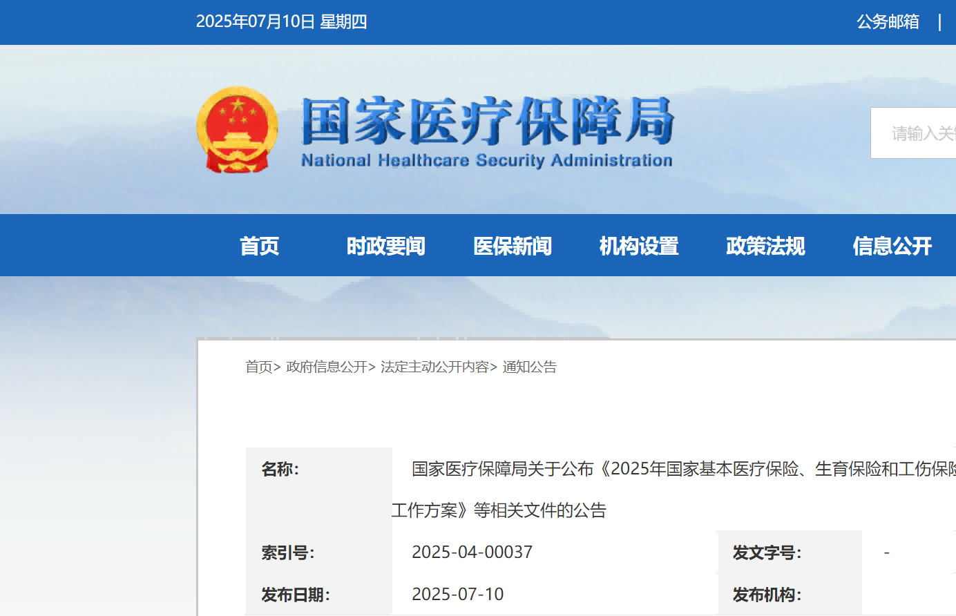 國家醫療保障局關于公布《2025年國家基本醫療保險、生育保險和工傷保險藥品目錄及商業健康保險創新藥品目錄調整工作方案》等相關文件的公告